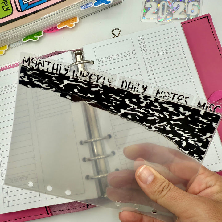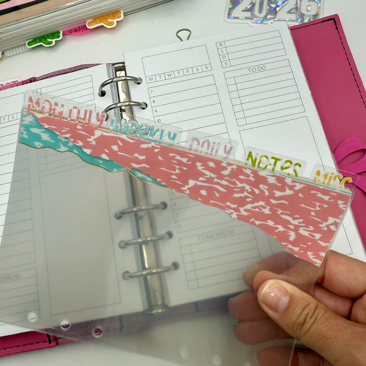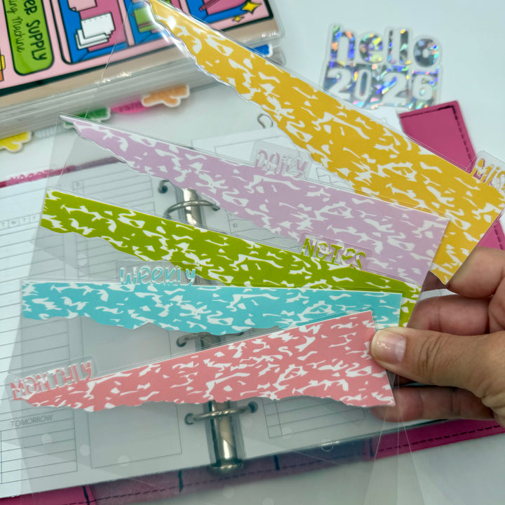 Set of 5 SIDE TAB planner dividers with a ripped composition notebook paper design. Customize with your choice of font with custom words or plain tabs, and your paper color choice.