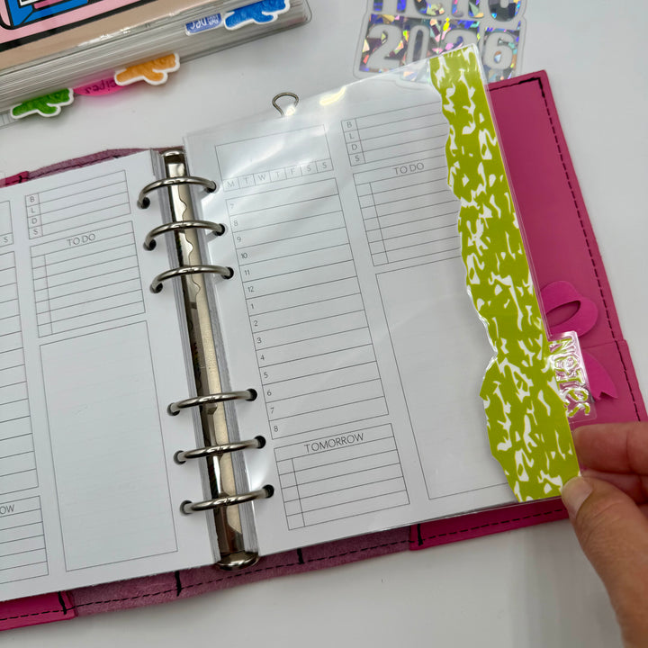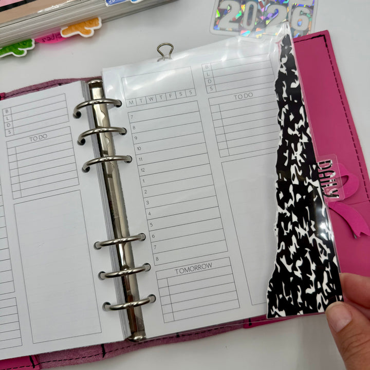 All sizes will be plain clear lamination, instead of notebook style planners (hobo weeks, stalogy, etc) which will be side loading dividers that slide on the page.