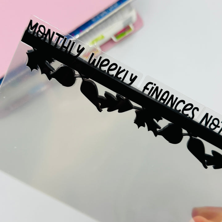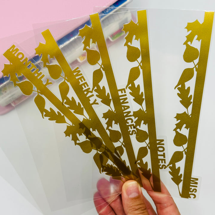 Set of 5 TOP TAB planner dividers with a leaf print border, in your choice of vinyl color. Also choose between a standard or whimsical font for you tab words.