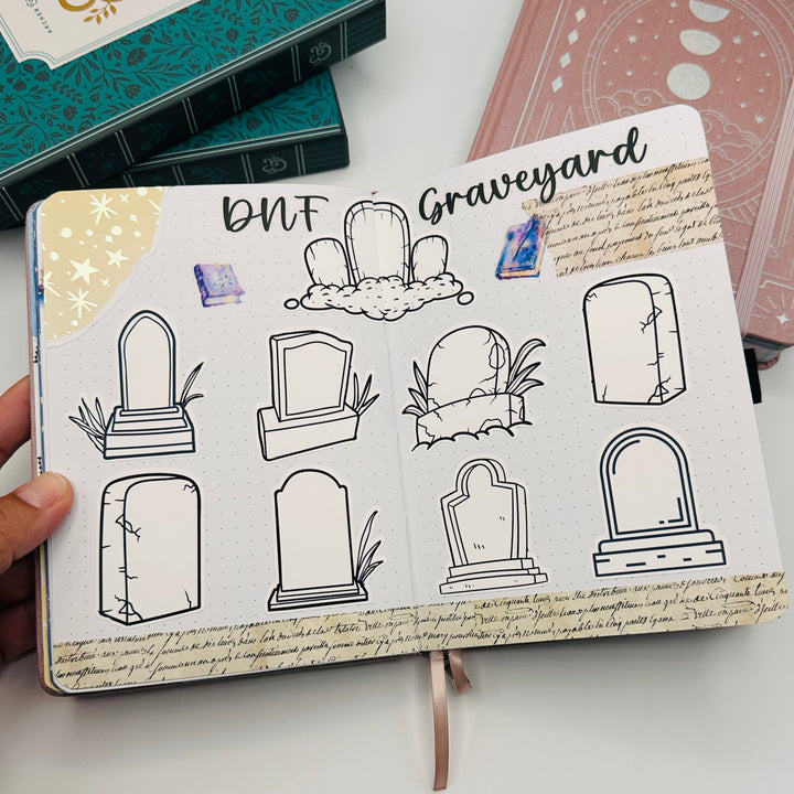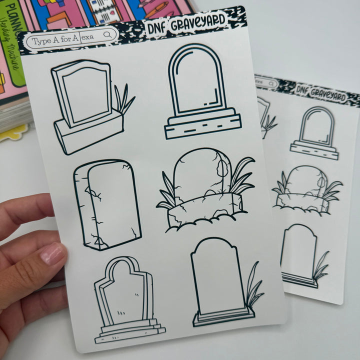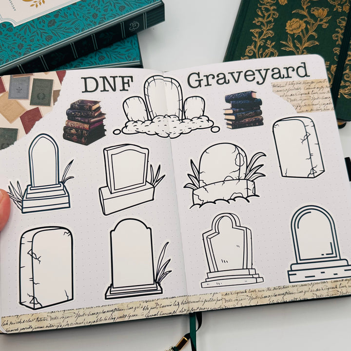 Decorate your reading journal, planners or notebooks with these empty tombstone DNF tracking stickers. Color in each tombstone or write the name of a recently unfinished book in each. Available in two sizes to fit most planners.