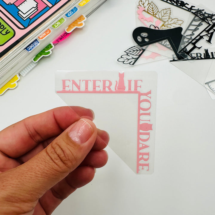 Decorate any style planner with this Enter If You Dare corner tab in your choice of vinyl color. Corner tabs work with any style or size of planner or notebook, they just slide over the top corner of any page.