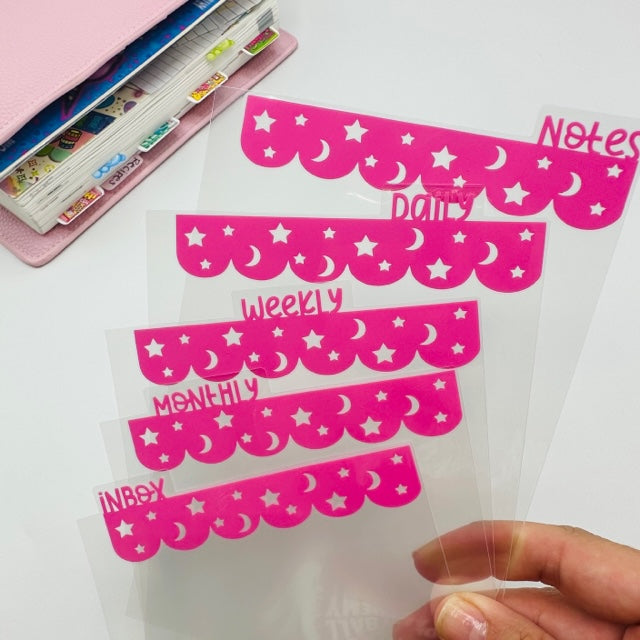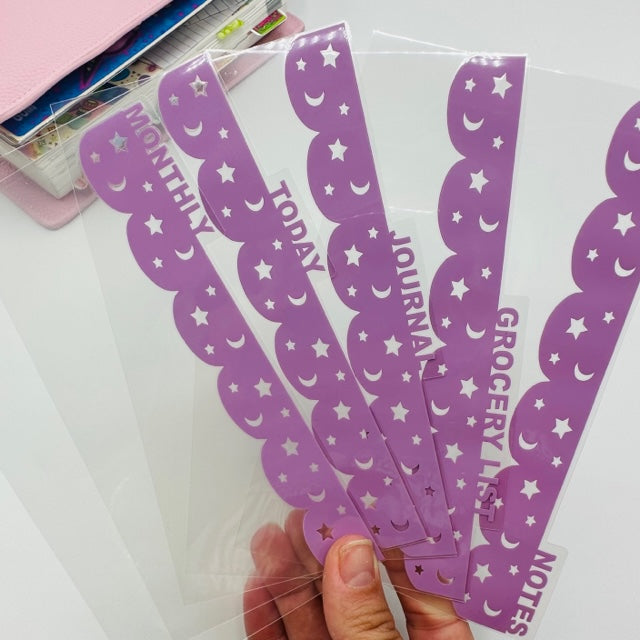 Set of 5 SIDE TAB planner dividers with a galaxy cutout border, in your choice of vinyl color. Also choose between a standard or whimsical font for you tab words.