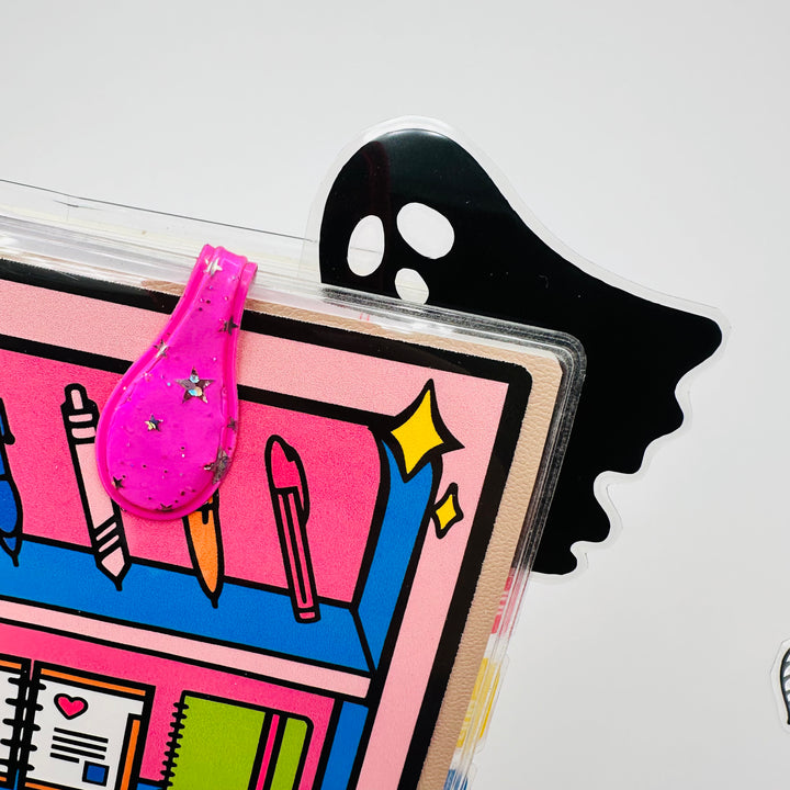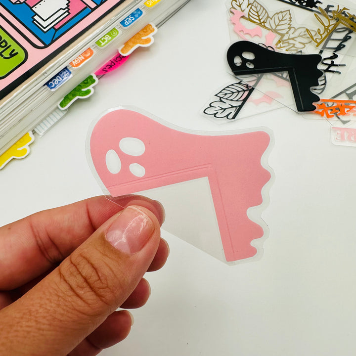 Decorate any style planner with this ghost corner tab in your choice of vinyl color. Corner tabs work with any style or size of planner or notebook, they just slide over the top corner of any page.