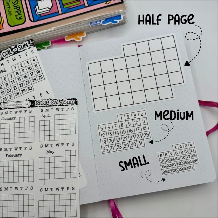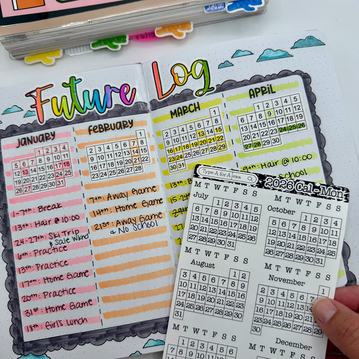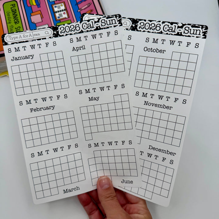 Add a full year at a glance to your notebooks or planners with these individually cut monthly calendar stickers. Six months on each sticker sheet, available in two different sizes, three different fonts and on either premium matte or clear sticker paper.