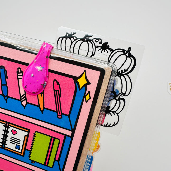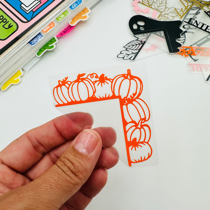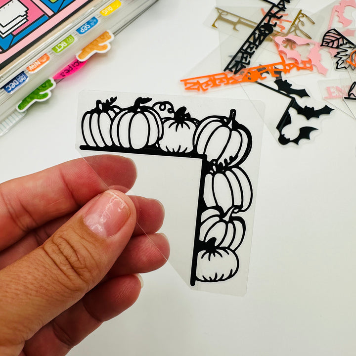Decorate any style planner with this pumpkin corner tab in your choice of vinyl color. Corner tabs work with any style or size of planner or notebook, they just slide over the top corner of any page.