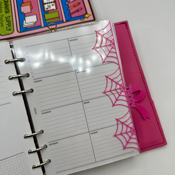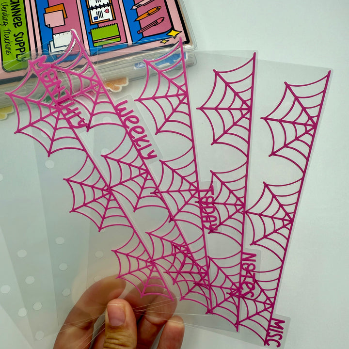 Set of 5 SIDE TAB planner dividers with a spider web cutout border, in your choice of vinyl color. Also choose between a standard or whimsical font for you tab words.