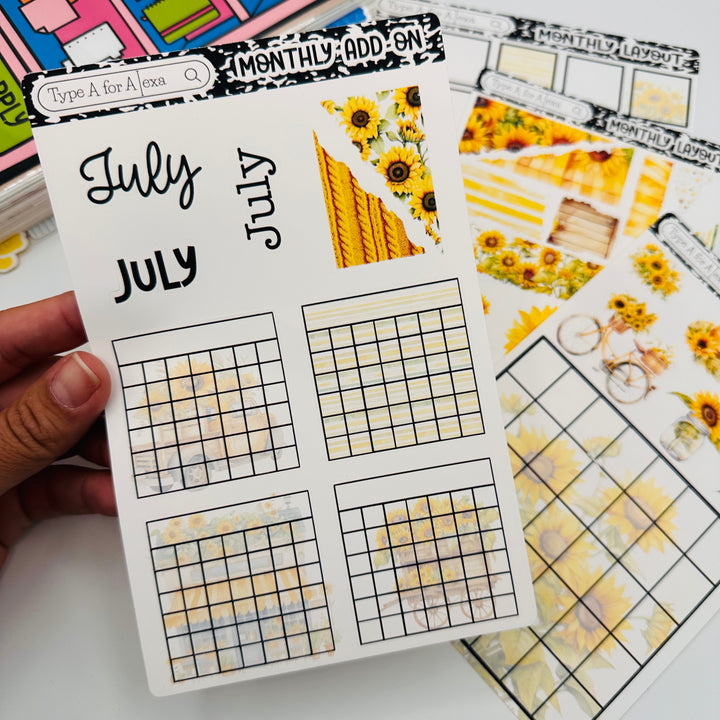 The kits comes with coordinating deco and ripped paper stickers, and you can choose the add on sheet that will give you the monthly header of your choice in 3 different fonts, 4 mini tracking calendar stickers and a couple extra pieces of ripped paper stickers. There are also coordinating full sticker sheets of more ripped paper stickers in separate listings if you happen to want more deco or extra to go on other pages of your notebooks.